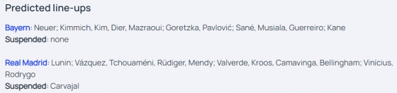 이밖에도 UEFA는 뮌헨이 해리 케인(31), 자말 무시알라(22), 요슈아 키미히(29) 등을 내세워 총력전으로 나설 것이라 봤다. 레알 마드리드 선발로는 주드 벨링엄(22), 비니시우스 주니오르(24), 페데리코 발베르데(26), 호드리구(23) 등을 추측했다. 주축 라이트백 다니 카르바할(32)은 경고 누적으로 뮌헨과 챔피언스리그 4강 경기에 결장한다.