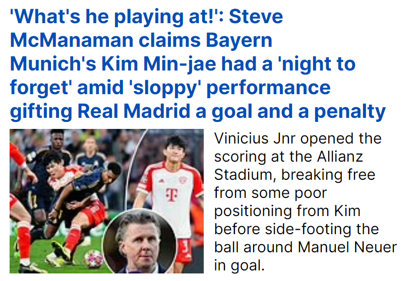 뮌헨은 홈에서 열린 챔피언스리그 1차전에서 다 잡았던 승리를 놓쳤다. 두 개의 실점 빌미를 제공한 김민재를 향한 비판은 당연했다. 맥마나만은 "김민재는 잊을 수 없는 밤을 보냈다. 다음 주 산티아고 베르나베우에서 다시 볼 수 있을까"라고 말했다. 오는 9일 레알 마드리드와 챔피언스리그 4강 2차전에서 김민재의 경기 출전 가능성을 낮게 본 발언이었다.