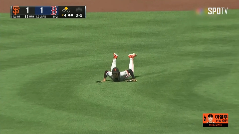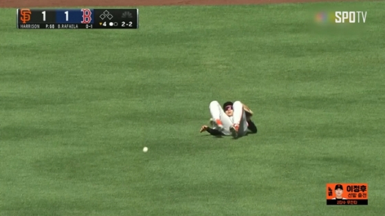 익숙지 않은 보스턴 홈구장 팬웨이 파크에서 낮경기로 치러졌고 중견수 방면으로 타구가 솟는 순간 태양에 공이 사라졌다. 이정후는 글러브로 해를 가리며 타구 방향을 찾아내려고 노력했지만 결국 방향을 잃고 뒤로 넘어졌다. 평범한 뜬공이었지만 라파엘라가 2루까지 향했다.