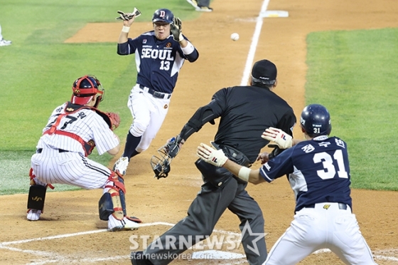 그런데 3회 엔스가 흔들리고 말았다. 또 한 번 두산의 발이 빛났다. 선두타자 정수빈이 볼넷을 골라낸 뒤 후속 허경민 타석 때 2루를 훔친 것. 허경민은 우중간 안타를 치며 무사 1, 3루 기회를 이어갔다. 엔스의 폭투가 나오면서 허경민이 2루로 간 가운데, 강승호는 삼진으로 물러났다. 하지만 양의지가 2타점 좌전 적시타를 터트리며 3-1로 달아났다.