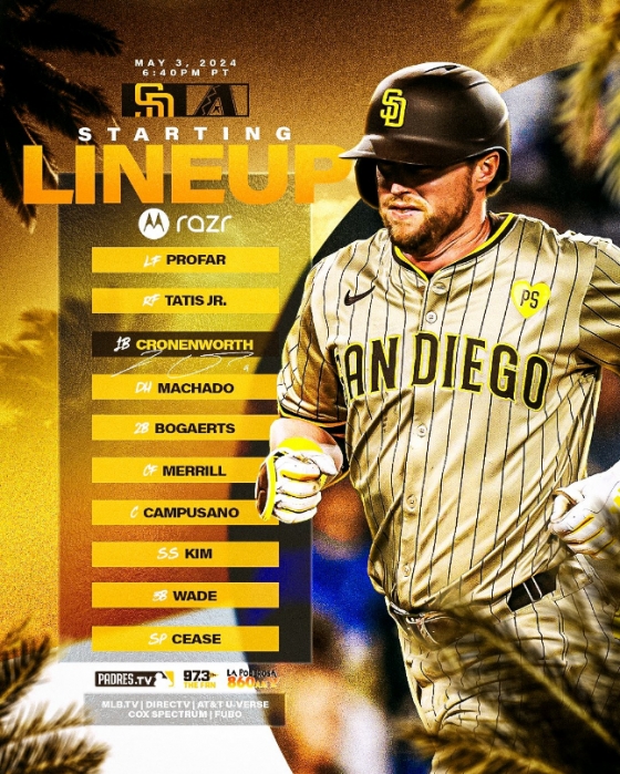 샌디에이고는 이날 주릭슨 프로파(좌익수)-타티스 주니어(우익수)-크로넨워스(1루수)-매니 마차도(지명타자)-잰더 보가츠(2루수)-잭슨 메릴(중견수)-루이스 캄푸사노(포수)-김하성(유격수)-타일러 웨이드로 타선을 꾸렸다. 선발 투수는 올 시즌 시즈.
