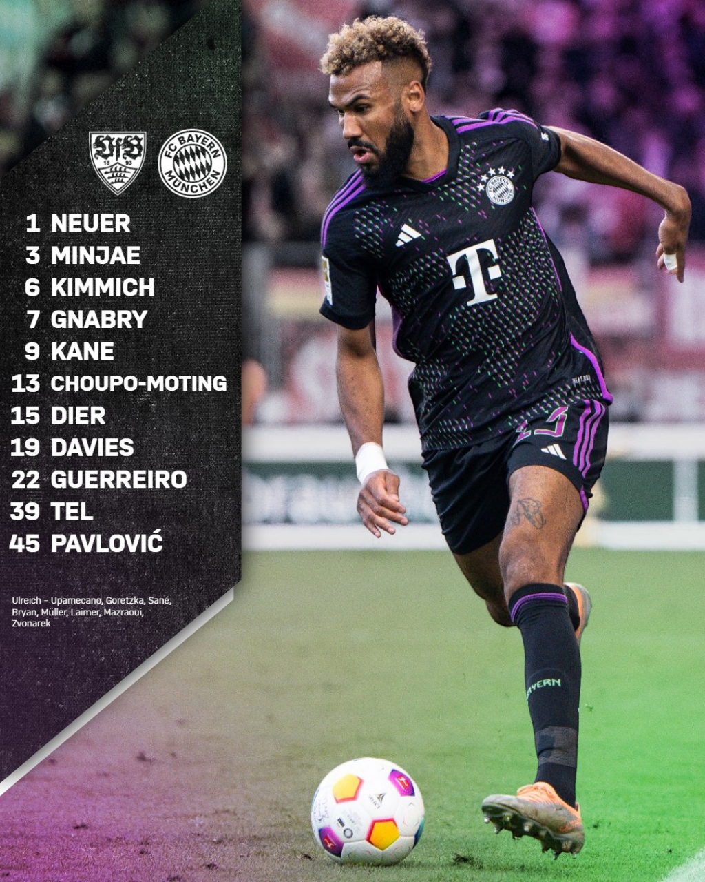 선발 명단이 공개됐다. 뮌헨은 해리 케인을 원톱에 두고 마티스 텔, 에릭 막심 추포 모팅, 세르주 그나브리를 2선에 배치했다. 하바엘 게히이루와 알렉산다르 파블로비치가 중원에 포진한다. 알폰소 데이비스, 김민재, 에릭 다이어, 요슈아 키미히가 포백을 맡는다. 골키퍼 장갑은 마누엘 노이어가 낀다.