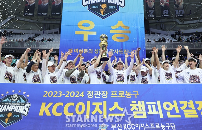 부산 KCC는 지난 5일 수원KT소닉붐아레나에서 열린 '2023~2024시즌 정관장 프로농구 챔피언결정전(7전4선승제)' 5차전에서 수원 KT를 88-70로 꺾었다. 이로써 KCC는 시리즈 4승1패로 챔프전 우승을 거머쥐었다.