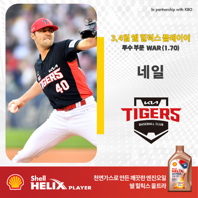 '쉘힐릭스플레이어'는 대체 선수 대비 승리 기여도(WAR)을 기반으로 선정하는데 3~4월 투수 부문에서는 KIA 네일이 WAR 1.70으로 1위를 차지했다. 네일은 평균자책점(ERA) 1위(1.47), 다승 1위(4승), 이닝 당 출루 허용(WHIP) 2위(0.98)에 볼넷은 단 3개만 내주는 등 4월 중순부터 랭킹 상위권에 모습을 드러낸 이후 1위 자리를 줄곧 지켜왔다.