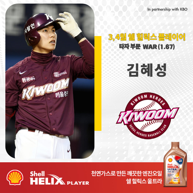 한편 한국쉘은 최상의 엔진 성능 유지를 통해 운전자의 도전과 영감을 주기 위한 캠페인 '쉘 힐릭스 드라이브-온 (Shell Helix Drive On)'의 일환으로 KBO 리그 선수들이 최상의 야구 퍼포먼스를 발휘하도록 앞으로도 매월 쉘힐릭스플레이어 시상을 후원할 예정이다.