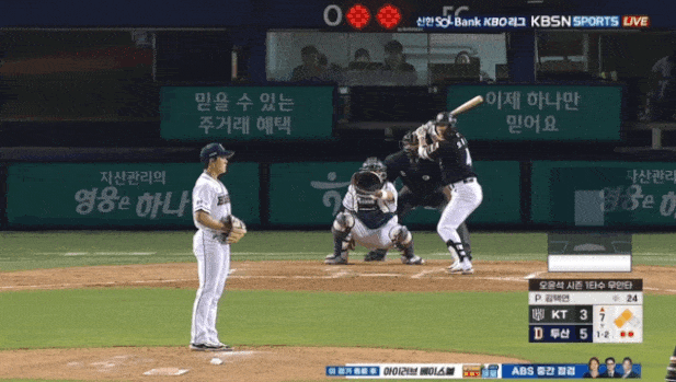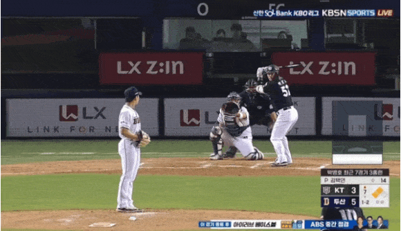 그러나 기우였다. 김택연은 시속 150㎞에 육박하는 빠른공을 연신 던졌다. 박병호가 좀처럼 타이밍을 맞추지 못했고 관중석에선 환호성이 터져나오기 시작했다. 김택연의 진정한 위력을 누구보다 잘 알고 있는 팬들이었다. 결국 박병호를 5구 승부 끝에 헛스윙 삼진으로 더그아웃으로 돌려보냈다. 삼진을 당한 하이 패스트볼에 박병호는 제대로 당했다.