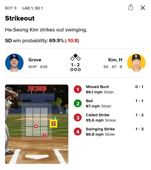 샌디에이고는 김하성에게 번트를 지시했다. 김하성은 바깥쪽 낮게 떨어지는 초구 슬라이더에 방망이를 내밀었다가 뺐다. 공은 스트라이크 존 안으로 들어오면서 1스트라이크. 바깥쪽으로 더 빠지는 2구째에는 번트를 대지 않았다. 1스트라이크1볼.