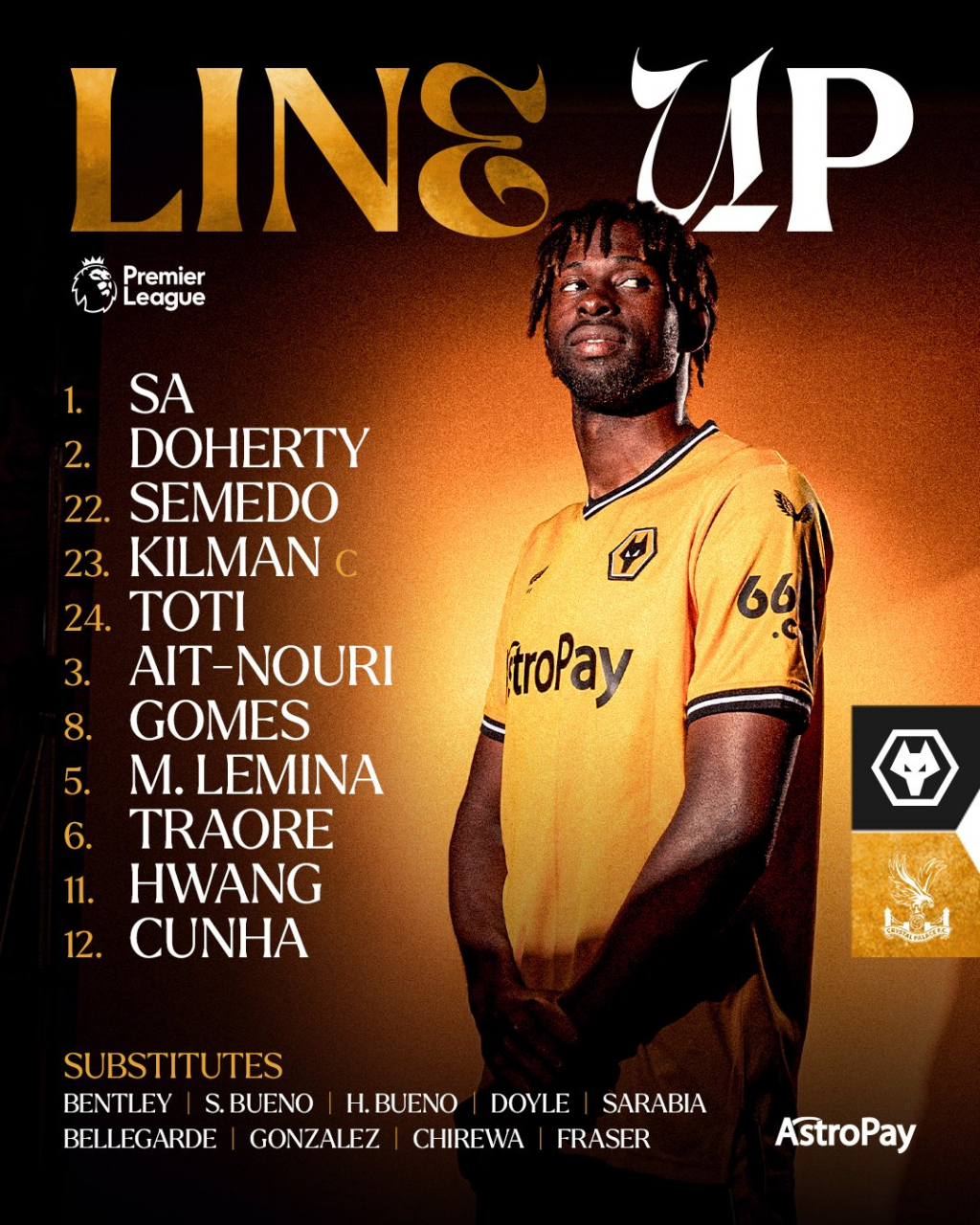 홈팀 울버햄튼은 중원에 라얀 아이트 누리, 바부카르 트라오레, 마리오 르미나, 주앙 고메스, 맷 도허티를 배치했다. 토티 고메스, 맥스 킬먼, 넬송 세메두가 스리백을 맡았다. 골키퍼 장갑은 다니엘 벤틀리가 꼈다.