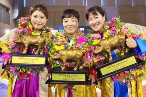 12일 대전광역시 유성구 한밭대학교체육관에서 열린 '위더스제약 2024 민속씨름 유성온천장사씨름대회'에서 양-이-임이 나란히 황소트로피를 들어올렸다.