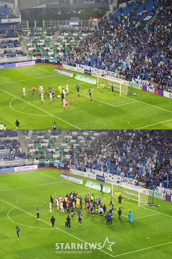 '물병 투척' 논란을 일으킨 인천 유나이티드가 제재금 2000만원 징계가 내려졌다. 뿐만 아니라 5경기 동안 응원석을 운영하지 못한다.