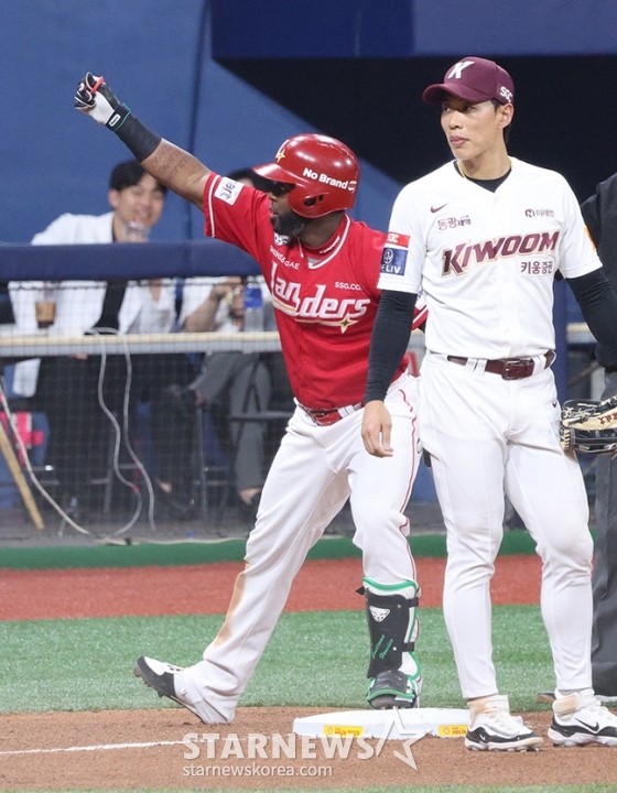 SSG 에레디아가 6회초 1사 1루에서 1타점 좌중간 2루타를 날리고 공이 홈으로 향하는 틈을 타 3루꺼지 진루한 후 독특한 세리머니를 선보이고 있다.