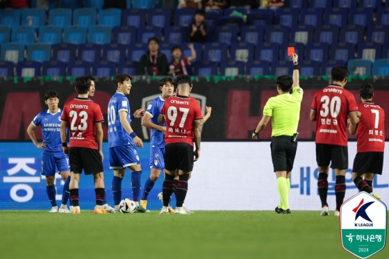 수원은 후반 6분 만에 수적 열세에 빠졌다. 수비수 백동규(33)가 레드카드로 그라운드를 떠났다.