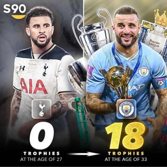 스포츠전문 스코어90은 20일(한국시간) 맨시티 수비수 워커의 우승 트로피 개수를 이적 전과 이적 후로 나눠 비교했다. 풀백과 센터백을 맡고 있는 워커는 지난 2017년까지 토트넘의 핵심 멤버로 활약했다. 하지만 단 1개의 트로피도 얻지 못했다. 그런데 맨시티에선 완전히 다른 경력을 쌓았다. 맨시티에 있는 6년간 무려 18개의 우승 트로피를 수집했다.