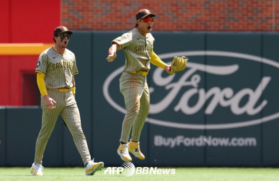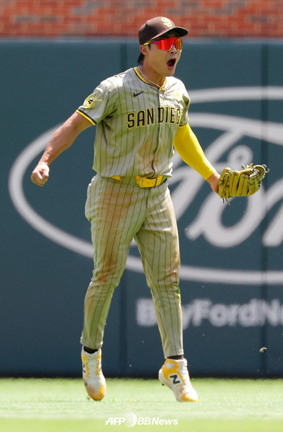 무엇보다 이날 최고의 장면은 9회말 수비에서 나왔다. 샌디에이고가 한 점 차 살얼음 리드를 지키고 있는 상황. 애틀랜타의 선두타자로 마이클 해리스 2세가 타석에 들어섰다. 볼카운트는 1-2. 이어 마이클 해리스 2세가 4구째를 공략했고, 타구는 유격수 김하성의 키를 넘겨 가운데 외야 쪽을 향해 날아갔다. 김하성은 정상 수비를 펼치고 있었다. 그리고 타구에 곧장 반응하며 공을 좇아가기 시작했다. 포물선을 그리다 뒤쪽으로 떨어진 공을 향해 몸을 날리며 잡아냈다. 환상적인 호수비였다. 타구 처리 후 김하성은 점프까지 하면서 기쁨을 온몸으로 표현했다. 미국 현지 중계 해설진 역시 "김하성의 엄청난 오버 더 숄더(Over the shoulder) 캐치"라며 감탄사를 연발했다.