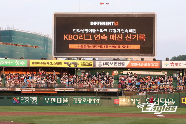 한화 다음으로는 두산 베어스와 KIA 타이거즈가 각각 9차례, LG 트윈스와 삼성 라이온즈가 7차례씩 매진을 이루며 많은 팬들을 홈구장으로 불러모으고 있다. 이를 바탕으로 KBO리그는 지난 16일 10개 구단 체제 출범 이후 가장 빠른 페이스로 300만 관중을 돌파하기도 했다.