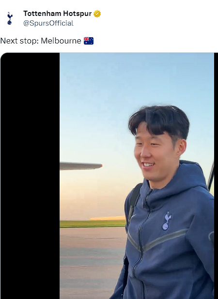 이미 토트넘 선수단은 호주에 도착했다. 토트넘 공식 채널은 "다음 도착지는 멜버른이다"라며 영상을 공개했다. 손흥민은 비행기에서 내리며 미소지었다.