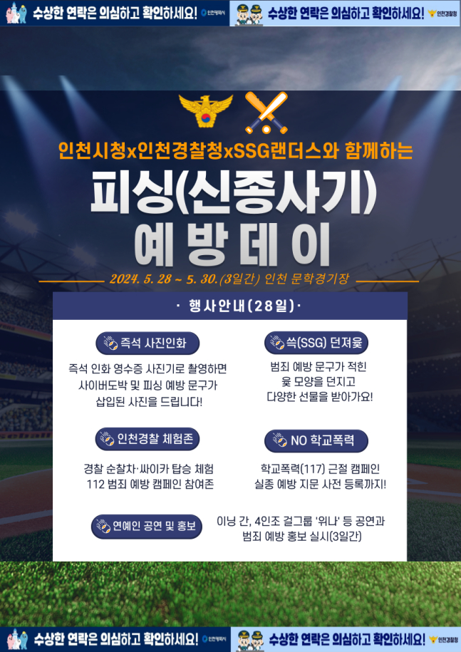 SSG는 "28일부터 30일까지 인천SSG랜더스필드에서 열리는 LG 트윈스와 홈 3연전을 맞아 인천시, 인천경찰청과 함께하는 '피싱예방 데이'를 진행한다"고 25일 밝혔다.