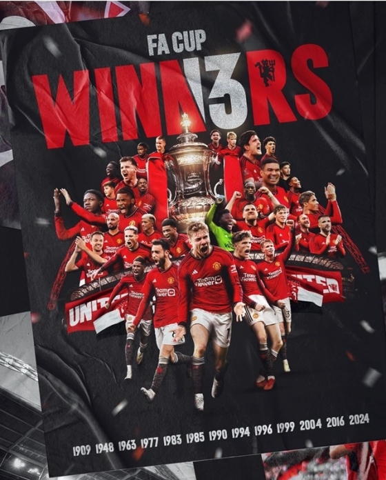 맨유는 25일(한국시간) 영국 런던의 웸블리 스타디움에서 열린 2023~2024 FA컵 결승 맨시티와 맞대결에서 2-1로 승리했다. 이로써 맨유는 지난 해 대회 결승서 맨시티에 당했던 패배를 1년 만에 설욕하고, 구단 통산 13번째 FA컵 우승 트로피를 거머쥐었다. 역대 최다 우승팀 아스널(14회)과 격차는 불과 1개차다.