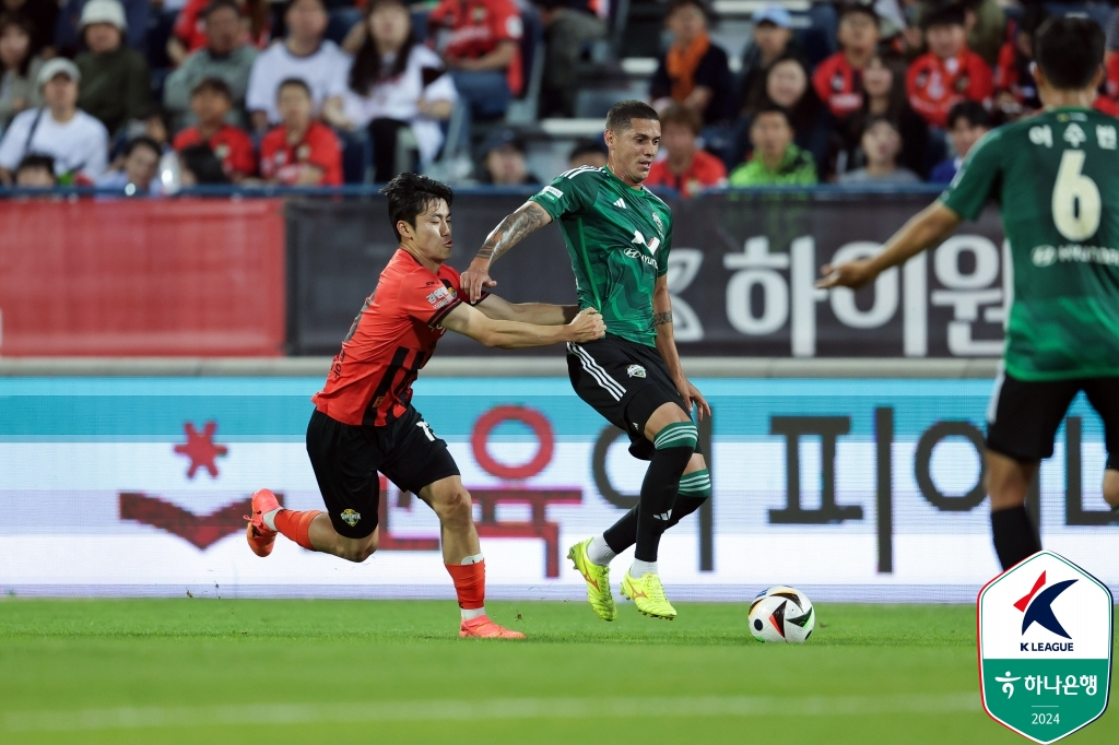 강원이 계속 몰아붙였다. 후반 38분 정한빈이 측면에서 전북 수비수의 볼을 빼앗아 중앙의 야고에게 패스했다. 하지만 야고의 슈팅이 골대 위로 떴다.