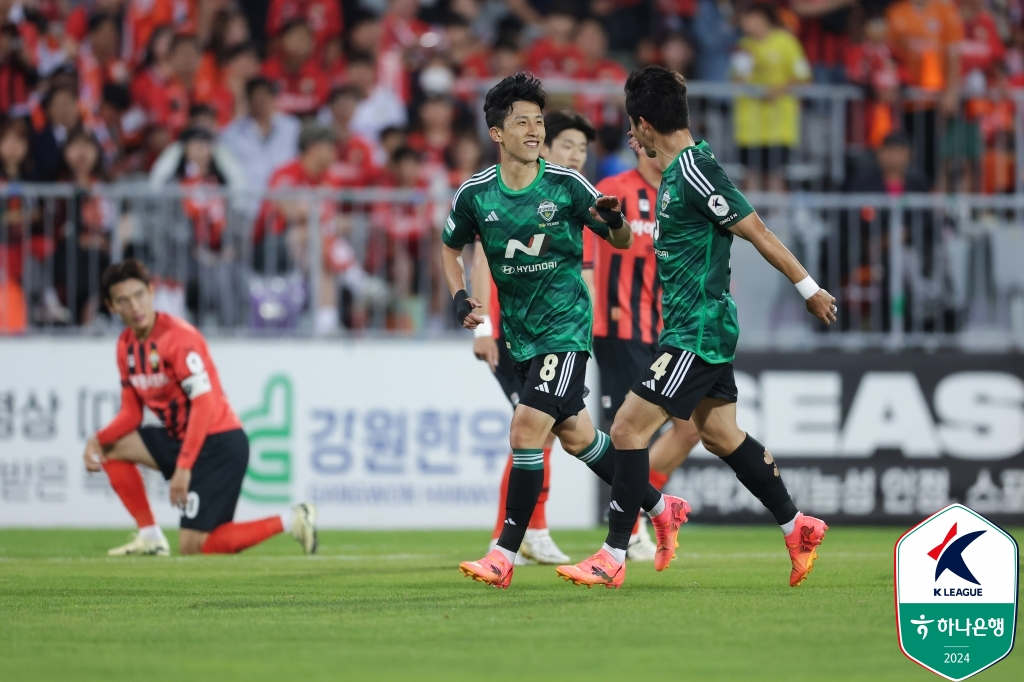 강원은 29일 오후 7시30분 춘천 송암스포츠타운에서 열린 '하나은행 K리그1 2024' 15라운드 원정에서 전북에 2-1로 승리했다. 3연승을 이어간 강원은 승점 25(7승4무4패)로 4위를 유지했다.