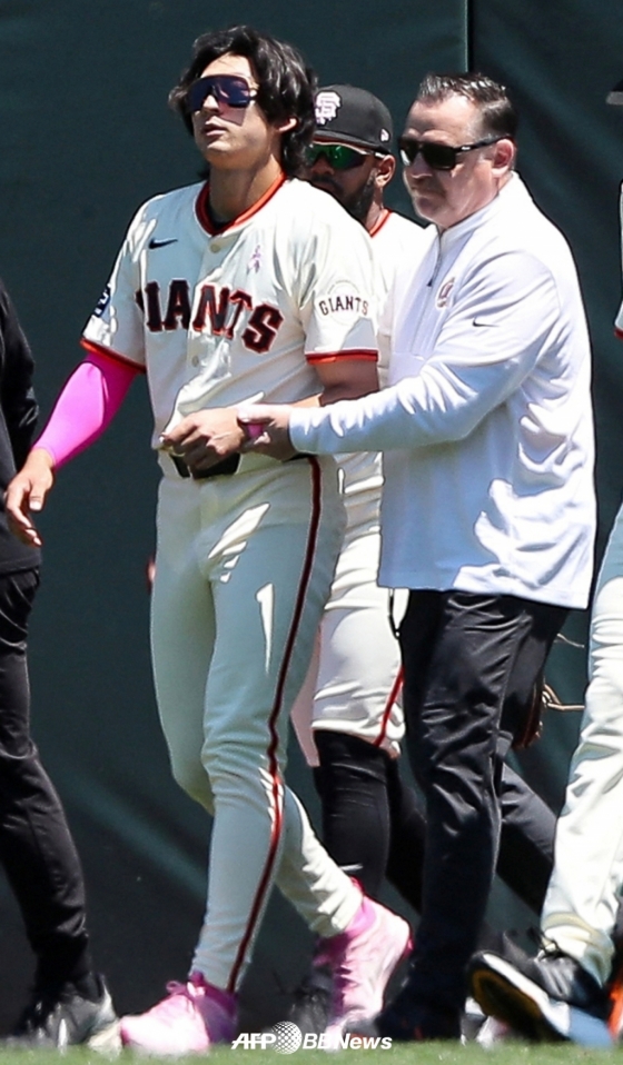 하지만 타구는 이정후의 글러브에 살짝 닿은 채 넘어가면서 펜스 위쪽을 맞은 뒤 그라운드 안으로 들어왔다. 동시에 몸을 날렸던 이정후는 펜스와 크게 충돌한 뒤 그 자리에 떨어진 채 어깨를 움켜쥐며 쓰러졌다. 이정후는 왼쪽 어깨 부위를 부여잡은 채 한동안 일어서지 못했다. 곧이어 샌프란시스코 구단의 트레이너와 통역이 그라운드로 들어와 이정후에게 뛰어갔다. 팀 동료 외야수도 모여들었고, 밥 멜빈 샌프란시스코 감독까지 이정후에게 다가온 뒤 상태를 살폈다. 결국 이정후는 더 이상 뛸 수 없었다. 트레이너가 이정후의 왼팔이 움직이지 않도록 꽉 붙잡으며 고정한 채로 걸어들어왔다.