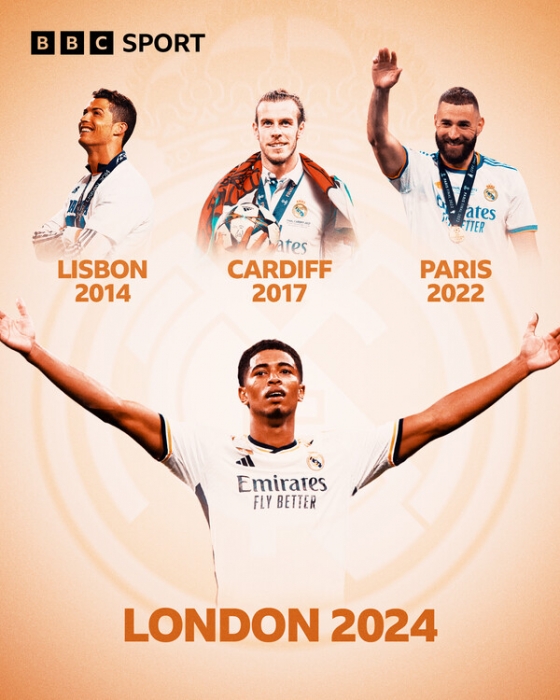 레알은 2일(한국시각) 영국 런던의 웸블리 스타디움에서 열린 도르트문트와의 '2023~2024시즌 유럽축구연맹(UEFA) 챔피언스리그(UCL)' 결승전에서 다니 카르바할, 비니시우스 주니오르의 연속골에 힘입어 2-0으로 승리했다.
