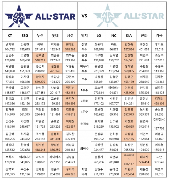 한국야구위원회(KBO)는 3일 2024 신한 SOL뱅크 KBO 올스타전 '베스트12' 팬 투표 1차 중간 집계 결과를 발표했다.