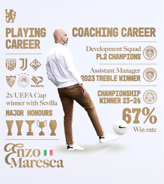 마레스카 감독은 지도자 시절 유럽 명장들과 함께 호흡해왔다. 첼시는 "펩 과르디올라(맨체스터 시티), 카를로 안첼로티(레알 마드리드), 마르셀로 리피(전 이탈리아 국가대표팀), 마누엘 펠레그리니(레알 베티스) 등과 함께했다"라며 "선수 시절에는 지네딘 지단, 지안루이지 부폰, 파벨 네드베드, 알레산드로 델 피에로 등 전설들과 어깨를 나란히 했다. 미드필더로서 팀의 주축 역할을 해냈다"라고 치켜세웠다.