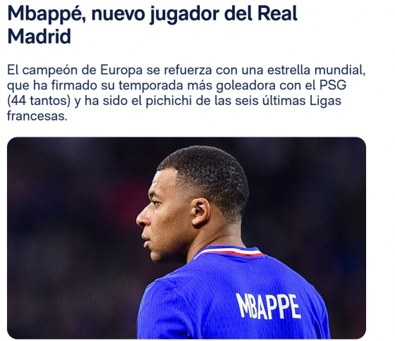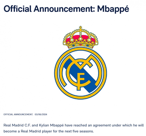 레알 마드리드는 4일(한국시간) 공식 채널을 통해 "음바페가 레알 마드리드에 합류했다. 레알 마드리드는 5년간 음바페와 함께한다"라고 발표했다.