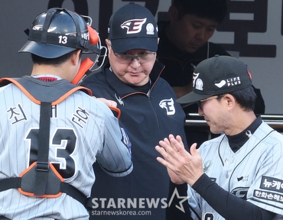 더그아웃으로 향하자 김경문 감독이 황준서에게 향했다. 한참 동안 이야기를 나누며 황준서를 진정시키는 것처럼 보였다.
