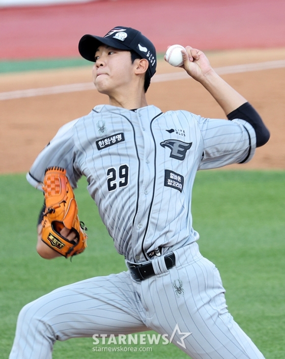 896승을 챙긴 명장의 한화에서 첫 경기. 열흘의 휴식을 보장받은 신인의 씩씩한 투구를 기대했으나 이날도 제구 난조는 계속됐다. 1회 무려 36구를 던졌다. 제구가 흔들리며 안타 하나 없이 볼넷 3개를 내주고 스스로 만루 위기를 자초했다. 문상철과 김민혁을 스플리터와 직구로 얼어붙게 만들며 가까스로 실점 위기를 지웠다.