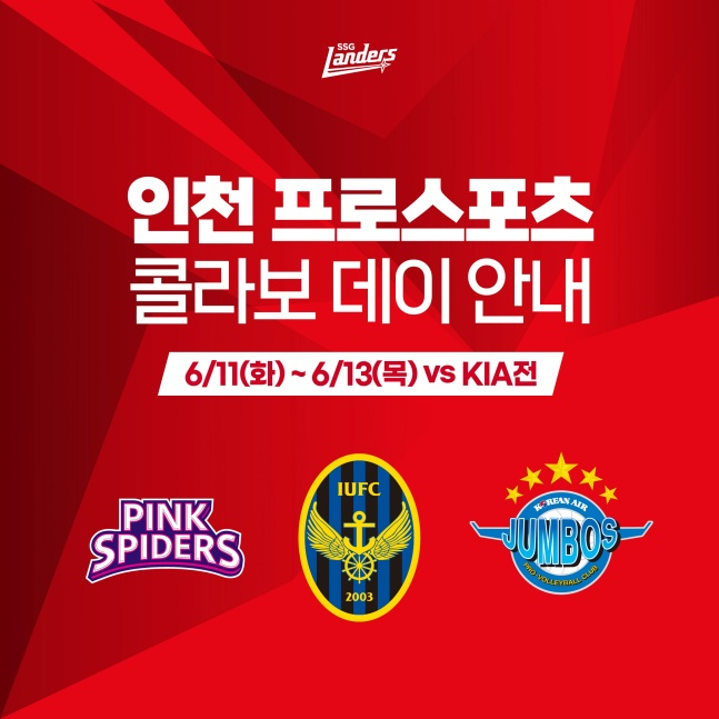 SSG는 "11일부터 13일까지 인천SSG랜더스필드에서 열리는 KIA 타이거즈와 주중 3연전을 맞아 '인천 프로스포츠 콜라보 데이'를 실시한다"고 7일 밝혔다.