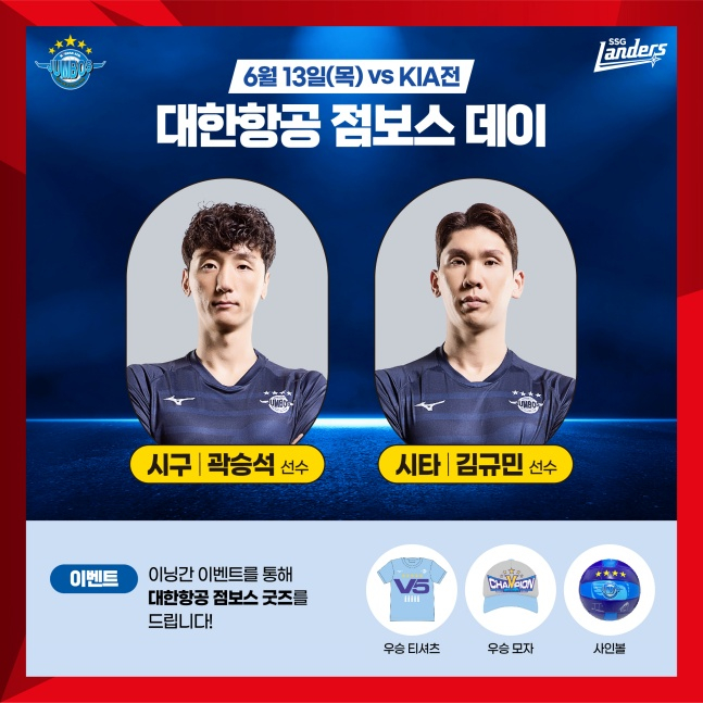 마지막으로 SSG는 대한항공 점보스 데이를 13일에 실시한다. 대한항공의 곽승석, 김규민 선수가 시구 및 시타에 참가하며, 이닝간 이벤트를 통해 관람객들에게 '대한항공 우승 기념 티셔츠 및 모자'와 '사인볼'을 제공한다.