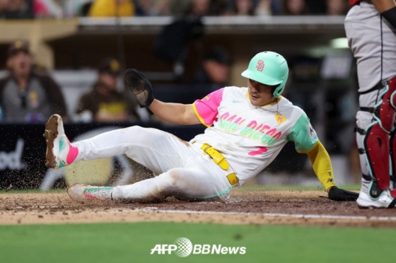 김하성은 팀이 2-0으로 앞선 4회 두 번째 타석에 들어선 뒤 득점까지 올렸다. 2사 주자 없는 상황. 김하성이 애리조나 선발 브랜든 팟을 상대로 볼카운트 2-2에서 몸쪽 싱커를 공략했다. 다소 먹힌 타구가 애리조나 중견수 캐빈 캐롤 앞에 뚝 떨어지는 안타로 연결됐다. 김하성의 진가는 이후에 나왔다. 후속 루이스 캄푸사노의 타구를 향해 애리조나 좌익수 제이크 맥카시가 다이빙 캐치를 시도했으나, 글러브 맞은 채 중견수 쪽으로 굴절됐다. 이를 놓치지 않은 김하성은 환상적인 폭풍 질주를 펼치며 2루와 3루를 돌아 홈까지 여유 있게 들어왔다. 김하성의 쾌속 질주에 샌디에이고 홈 팬들은 열광했다.