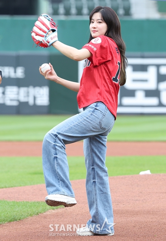 배우 박주현이 경기에 앞서 롯데 자이언츠 승리기원 시구를 하고 있다.