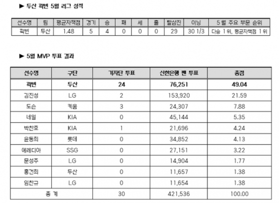 한국야구위원회(KBO)는 곽빈이 기자단 투표 총 30표 중 24표(80%), 팬 투표 42만 1536표 중 7만 6251표(18.1%)로 총점 49.04점을 받아 5월 월간 MVP로 선정됐다고 11일 발표했다. 2위는 기자단 투표 2표, 팬 투표 15만 3920표로 총점 21.59점을 기록한 LG 김진성이었다.