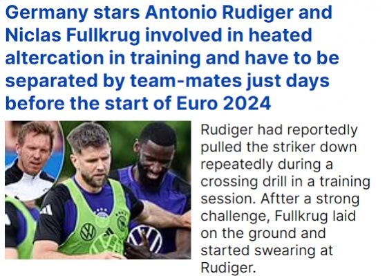 영국 '데일리 메일' 등 복수 매체는 11일(한국시간) "독일 스타 안토니오 뤼디거(레알 마드리드)와 니클라스 퓔크루그(보루시아 도르트문트)는 유로 2024 개막을 며칠 앞두고 훈련에서 다퉜다"라며 "뤼디거는 퓔크루그를 반복적으로 잡아당겼다. 퓔크루그는 이에 뤼디거에 다가가 욕설을 퍼부었다"라고 보도했다.