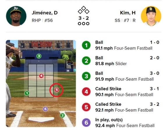 김하성은 경기 후반 아쉬운 판정 속에 출루할 기회를 날리고 말았다. 7회 말 공격에서 선두타자로 나온 그는 우완 대니 히메네스에게 연달아 3볼을 받아 다시 유리한 카운트를 맞이했다. 가운데로 들어온 4구를 지켜본 그는 5구째 바깥쪽 패스트볼도 골라냈지만, 심판은 스트라이크 판정을 내렸다.