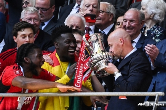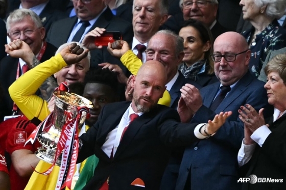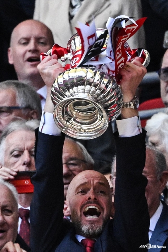2023~2024시즌 잉글랜드축구협회(FA)컵 트로피를 들고 환호하는 에릭 텐 하흐(가운데) 감독. /AFPBBNews=뉴스1