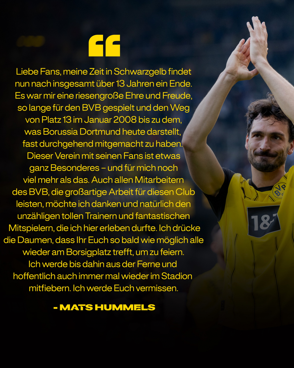 훔멜스는 공식 채널을 통해 작별 인사를 남겼다. 그는 "도르트문트에서 13년이 넘는 시간을 보냈다. 이제 끝을 맞이하게 됐다"라며 "팬들과 함께한 이 구단은 특별함 그 이상이었다. 도르트문트 직원들에게도 감사의 말을 전하고 싶다"라고 밝혔다.