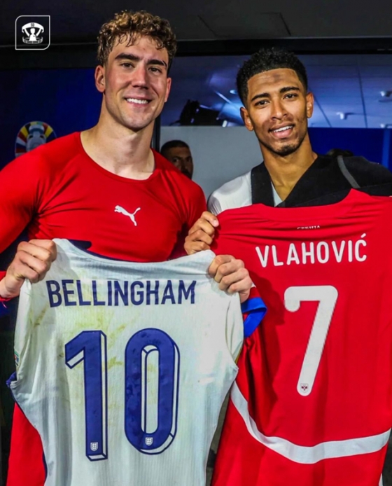 스포츠전문 섹타 데포르티바는 17일(한국시간) 이날 열린 유럽축구선수권대회(유로) 2024 C조 조별리그 1차전 세르비아-잉글랜드 맞대결을 마치고, 블라호비치와 벨링엄이 서로의 유니폼을 교환하며 포즈를 취하는 모습을 소개했다. 블라호비치는 세르비아의 핵심 공격수, 벨링엄은 잉글랜드 에이스로 활약했다.