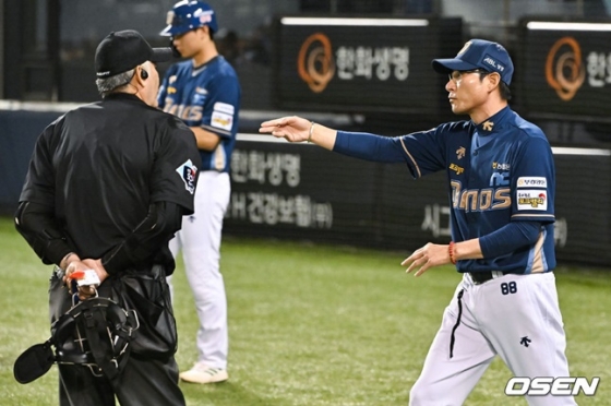 베이스 커버에 들어간 유격수 김주원의 왼발에 막혀 이유찬의 베이스 터치가 이뤄지지 않아 아웃을 선언한 것인데 이 과정에서 이승엽 감독이 극렬히 항의를 했다.