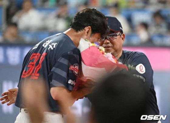 그는 첫 타자 강백호를 5구 만에 우익수 플라이로 잡아냈다. 다음 타자 오재일에게는 초구에 우익수 쪽 안타를 내준 뒤 박진형과 교체됐다. 진해수가 마운드를 내려오자 김태형 롯데 감독과 동료 투수 김원중이 꽃다발을 전하며 대기록을 축하했다.
