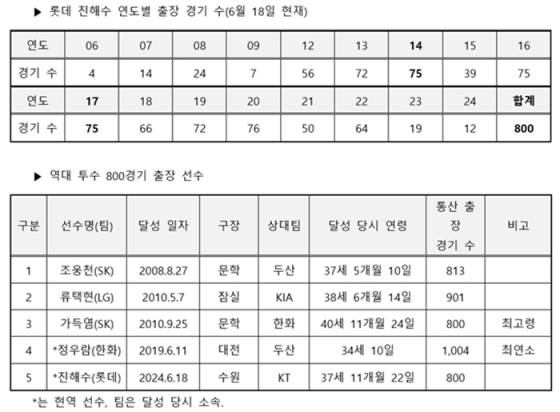 롯데 자이언츠 좌완 진해수(38)가 KBO리그 역대 5번째 투수 개인 통산 800경기 출장 기록을 달성했다. 진해수는 지난 18일 수원 케이티위즈파크에서 열린 KT 위즈와 원정 경기에서 4-6으로 뒤진 7회말 시작과 함께 팀의 3번째 투수로 마운드에 올랐다. 2006년 프로 데뷔 후 정확히 800번째 등판이었다.
