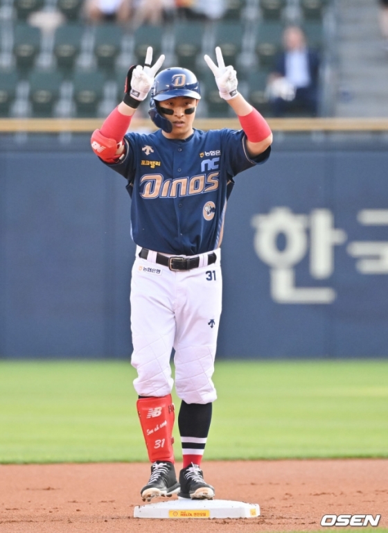 NC 손아섭이 지난 18일 잠실 두산전 1회 초 1사에서 2루타를 치고 세리머니하고 있다.