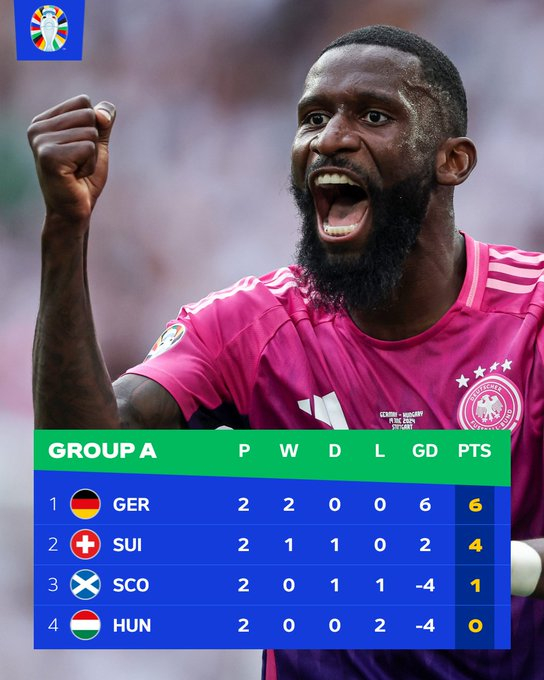 유로 개최국 독일은 조별리그 1차전 스코틀랜드전(5-1 승), 2차전 헝가리전에서 모두 승리하며 16강 진출을 일찌감치 확정 지었다. 헝가리는 스위스(1-2패)와 독일에 연달아 패배하며 2연패 수렁에 빠졌다.