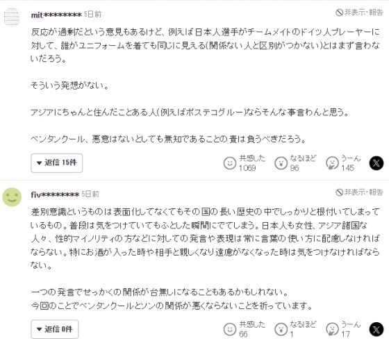 일본에서도 손흥민의 상황을 잘 알고 있었다. 일본 매체 '슈퍼 월드 사커'는 벤탄쿠르의 인종차별 사건을 보도했다. 해당 기사에 일본 팬들은 "벤탄쿠르가 악의가 없었다고 한들, 무지에 대한 책임은 져야 할 것", "평소에는 조심하다가도 나라의 역사 속에 뿌리내린 인종차별이 문득 나온다", "손흥민과 벤탄쿠르 관계가 나빠지지 않았으면 좋겠다"라고 댓글을 달았다.