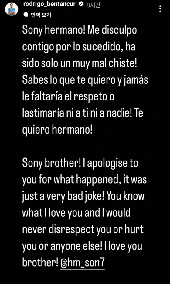 주장이 먼저 대인배 면모를 보였다. 손흥민은 20일 개인 SNS를 통해 "이미 롤로(벤탄쿠르)와 얘기를 했다. 그는 실수를 알고 있고, 제게 사과를 했다"라며 "그는 의도적으로 모욕적인 말을 한 것이 아니다. 우리는 여전히 형제고 이는 변하지 않았다. 하나가 되어 토트넘을 위해 싸우기 위해 프리 시즌에 함께할 것"이라고 밝혔다.