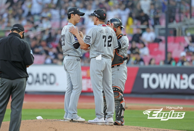 투수 코치와 포수 최재훈이 마운드에 올랐지만 달라지는 건 없었다. 김도영에게도 볼넷을 허용했고 밀어내기로 1-1 동점을 허용했다.