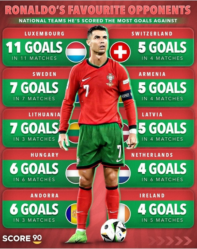 축구전문 스코어90은 23일(한국시간) 호날두가 기록한 130골 중 어느 팀을 상대로 가장 많은 골을 넣었는지 소개했다. 호날두는 룩셈부르크전에서 11골을 넣으며 최다골을 기록했고, 스웨덴, 리투아니아를 상대로는 7골을 터뜨렸다. 헝가리, 안도라전에선 6골씩, 스위스, 아르메니아, 라트비아 경기에선 5골을 뽑아냈다.